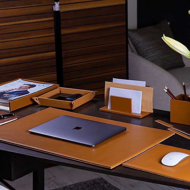 The range of leather desk sets proposed by LUCRIN puts forward an impressive catalogue of desk accessories & office products combinations. In so doing, we are offering you the opportunity to find the office accessories that you need, conceived by our finest leather artisans. Made with authentic leather and in a unique palette of colours, you will definitely add a distinct touch of class to your office décor. The desk sets come in several styles and designs: round, classic, square, soft, inter alia. Our leather office sets are also well coveted among professionals who use them in conference or meeting rooms. They can even be customised, for example, with the logo of the company.